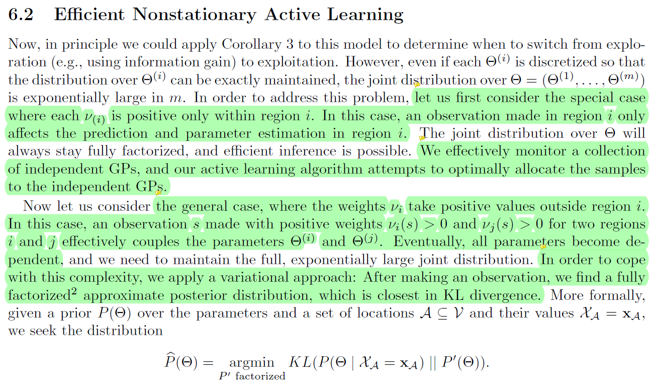 Caselton and Zidek (1984) proposed the mutual information criterion for observation selection, $\text{MI}(\mathcal{X}_\mathcal{A}) = H(\mathcal{X}_{\mathcal{V}\backslash\mathcal{A}}) − H(\mathcal{X}_{\mathcal{V}\backslash\mathcal{A}} | \mathcal{X}_\mathcal{A})$. 看不懂 Guestrin et al. (2005) showed that this criterion selects locations which most effectively reduce the uncertainty at the unobserved locations, hence it often leads to better predictions compared to the entropy criterion.