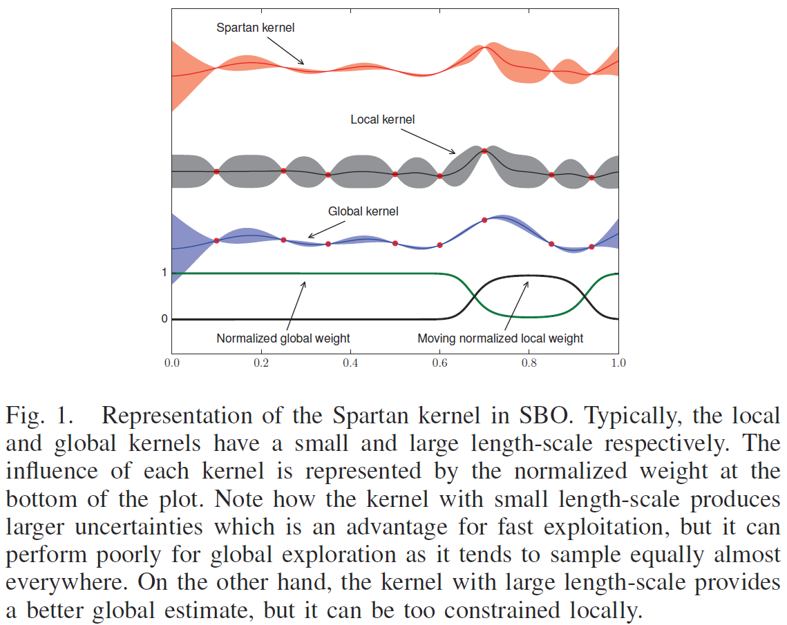 For Bayesian optimization, we propose the combination of a local and a global kernels and with multivariate normal distributions as weighting functions. We have called this kernel, the Spartan kernel: (这里的 local kernel 是指上述 [4] 中那种 mixed GP 的 combined kernel function,而不是其中具体的 each local GP。)